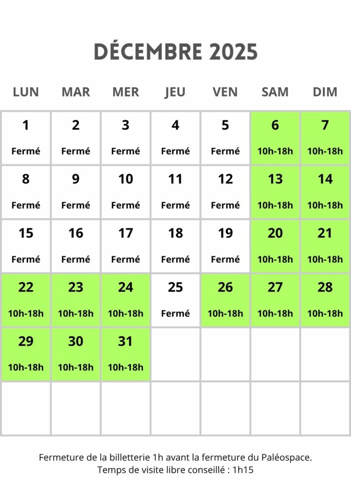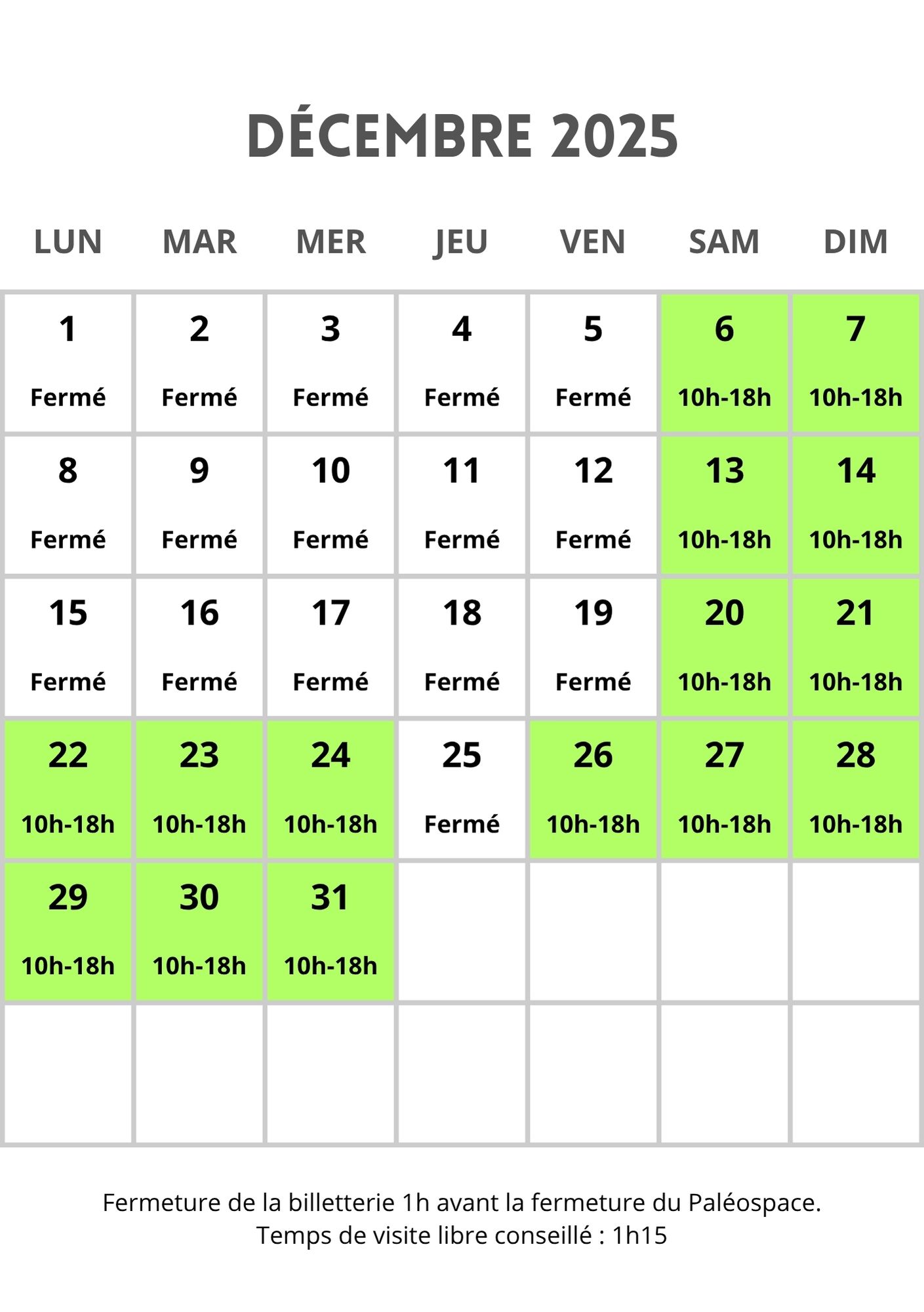 Retrouvez les horaires d’ouverture du Paléospace ci-dessous :